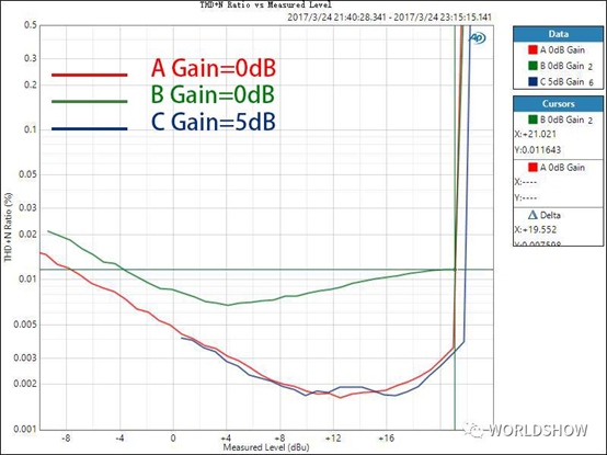 图4. A型号调音台话放增益在不同时的THD+N Level