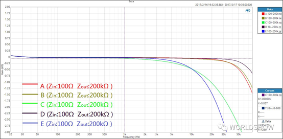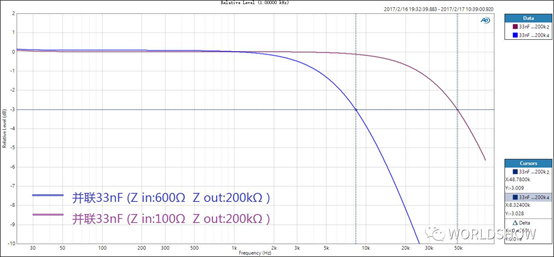 通过以上两幅测试对比,我们基本可以了解专业音频系统中话筒线对信号传输质量的影响,主要表现在高频的衰减上。而对于非专业设备、输出阻抗设计不合理或被错误设置到很高的情况下,会发生怎样的改变?